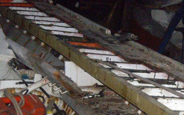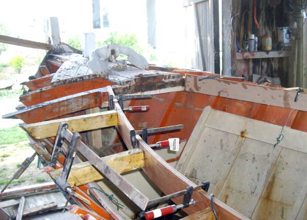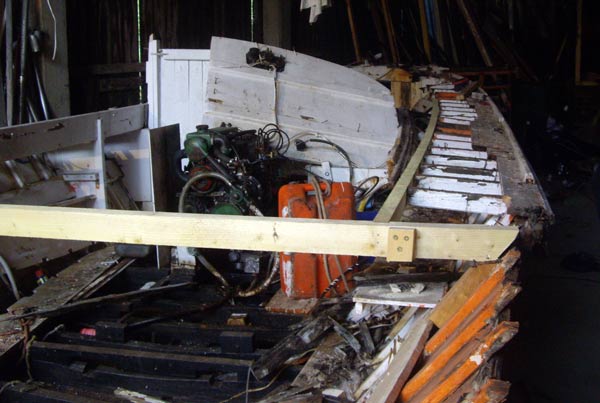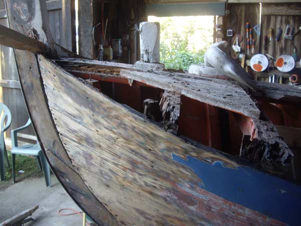 Courant du mois de septembre 2009, je me suis lancé dans la restauration de cette pinasse. Le pont était pourri, la cabine pas loin de l’être aussi, seule la coque avait été à peu près sauvegardée du manque d’entretien.