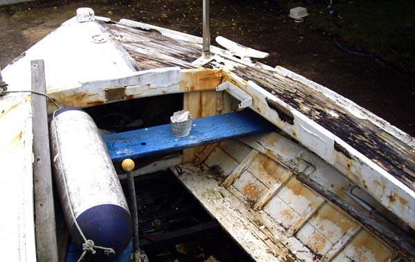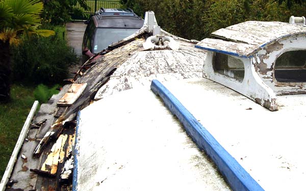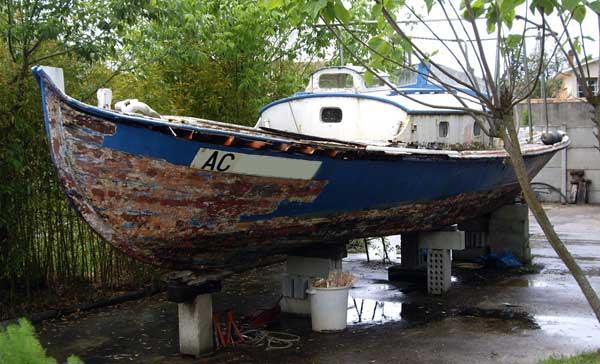 Je crois que le commun des mortels aurait renoncé en le voyant. Le pont était complètement pourri, la coque encore saine était remplie d’eau et cette pinasse devait être là depuis au moins trois ans.